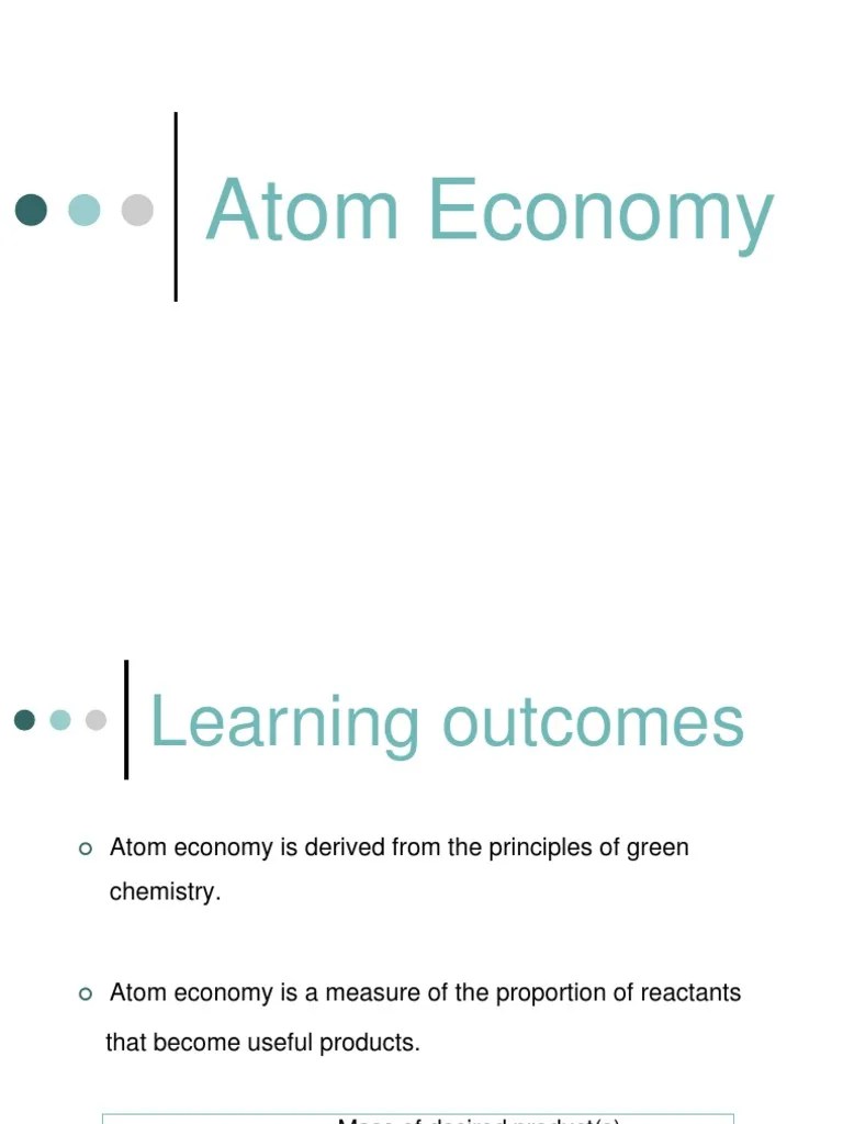 The purposeful design of chemical products and processes that minimize the use of environmentally hazardous substances and the generation of waste is known as green chemistry. Atom economy, which was developed by barry trost 1 , asks the question "what atoms of the reactants are incorporated into the final desired product(s) and what atoms are wasted?" 04.04.2014 · atom economy, the 2nd principle of green chemistry, comes down to preventing waste on a molecular level. Atom economy, which was developed by barry trost 1 , asks the question "what atoms of the reactants are incorporated into the final desired product(s) and what atoms are wasted?"
